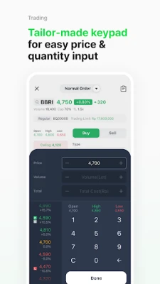 Don gudanar da cinikinka ba tare da wata matsala ba, wannan manhaja tana ba ka damar zaɓin yanayin ciniki da ya fi dacewa da kai. Za ka iya canza nau'ikan umarni (order modes) kai tsaye a cikin shafin umarni ba tare da buƙatar komawa menu ba. Muna da tsararren madannai (keypads) da aka keɓance su ga kowane yanayin ciniki, wanda ke sauƙaƙa maka shigar da farashi da adadin hannayen jari da kake son siya ko sayarwa. Bugu da ƙari, adadin hannayen jari da kake son umarnin iya cika kai tsaye bisa ga jimillar adadin kuɗin da kake so ka saka ko ka karɓa, yana sa ciniki ya kasance mai sauƙi da sauri.